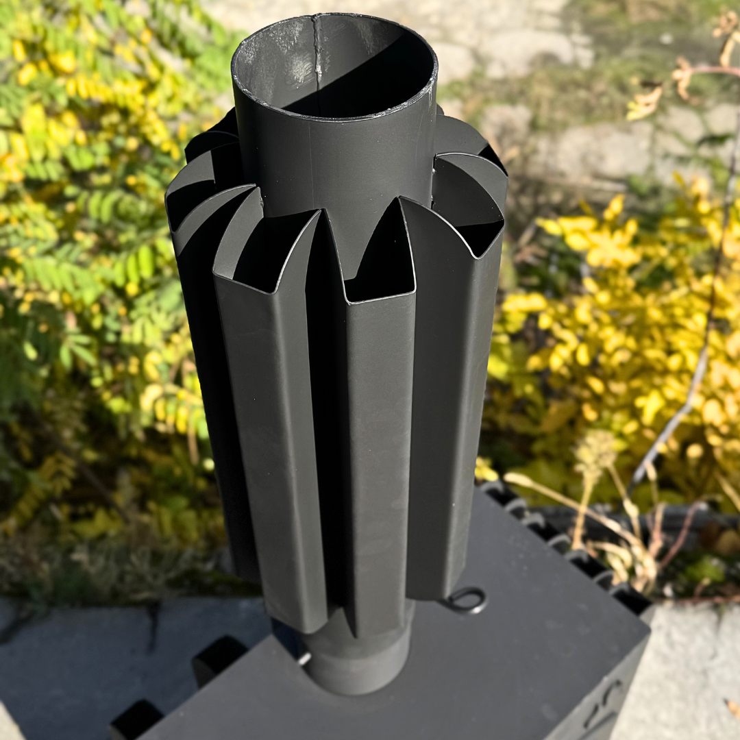 Виготовлений із міцної сталевої товстостінної труби, до якої приварені вісім прямокутних конвекційних каналів. Пристрій встановлюється на перший відрізок димаря — там, де температура найвища. Гаряче повітря, проходячи через систему вертикальних каналів, рівномірно розподіляється по всій поверхні труби, створюючи потужний потік теплого повітря. У результаті приміщення прогрівається значно швидше, а теплова віддача печі зростає без додаткової витрати палива.